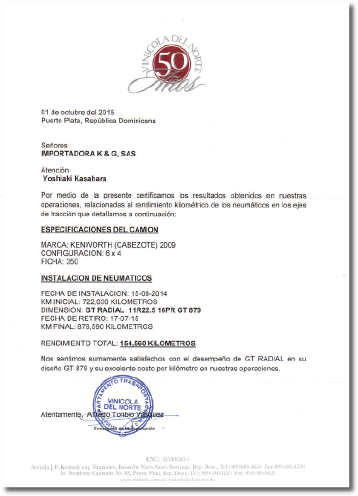 We confirm our total satisfaction with the performance of captioned GT879 pattern and excellent cost/km rate for our operation.